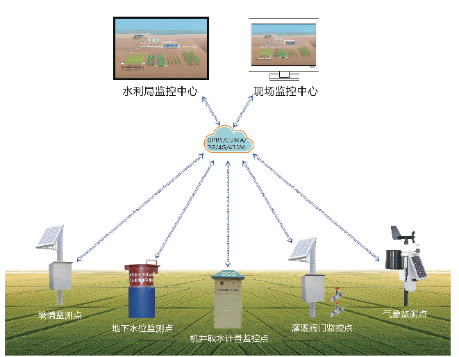 節(jié)水增糧信息化監(jiān)控系統(tǒng)基于機(jī)井取水計(jì)量監(jiān)控、地下水位監(jiān)測(cè)、土壤墑情監(jiān)測(cè)、田間氣象監(jiān)測(cè)、灌溉自動(dòng)控制等系統(tǒng)進(jìn)行多功能設(shè)計(jì),采用GPRS/CDMA或433MHZ的無(wú)線通信方式,實(shí)現(xiàn)監(jiān)控中心對(duì)多測(cè)點(diǎn)的遠(yuǎn)程監(jiān)控,為農(nóng)田水利管理和水資源監(jiān)管提供了可靠的技術(shù)保障。